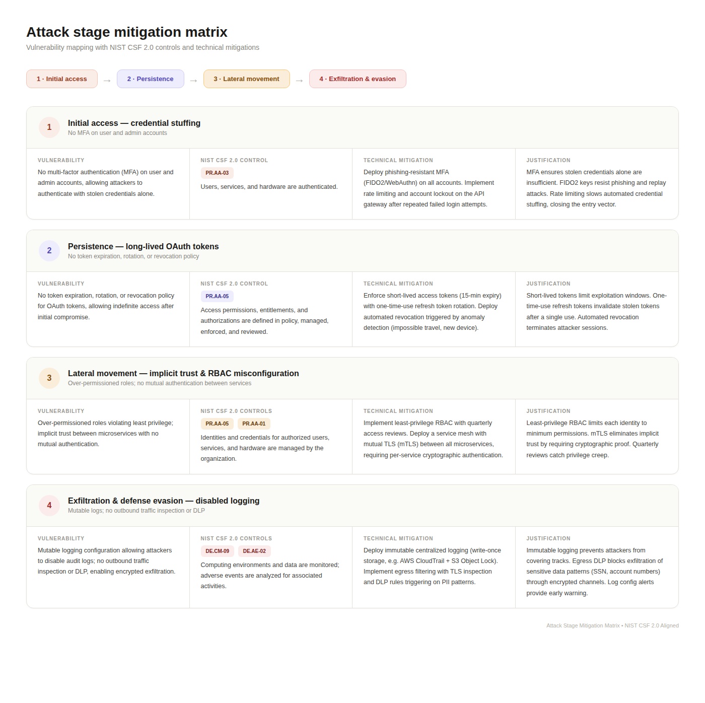 Activity 1: Attack Stage Identification and Corresponding Vulnerabilities Helios is a cloud-based financial services provider delivering web and mobile banking solutions. Their architecture includes a customer-facing API gateway, an IAM system using SSO/OAuth, and a centralized data platform storing PII and financial records. The company suffered a multi-stage attack that progressed through four distinct phases. The following analysis identifies each attack stage and the underlying vulnerability that enabled it. Stage 1: Initial Access — Credential Stuffing The attackers used credential stuffing to gain initial access. Credential stuffing is an automated attack that uses breached username/password pairs from other compromised services to attempt authentication against a target system. Because users frequently reuse passwords across platforms, a percentage of these credentials will be valid. The vulnerability that enabled this stage was the absence of Multi-Factor Authentication (MFA) on Helios’s authentication system. Without MFA, a correct password alone was sufficient to authenticate, giving the attackers a foothold in the environment. Stage 2: Persistence — Long-Lived OAuth Tokens After gaining initial access, the attackers established persistence by obtaining long-lived OAuth tokens. OAuth tokens (access tokens and refresh tokens) are issued after successful authentication and are used to authorize subsequent API requests without re-entering credentials. If access tokens have excessively long lifetimes, or if refresh tokens can be reused indefinitely without rotation or revocation, an attacker can maintain persistent access without needing the original credentials again. The vulnerability was the lack of a proper token lifecycle management policy, specifically the absence of short token expiry times, one-time-use refresh token rotation, and anomaly-triggered token revocation. Stage 3: Lateral Movement — Implicit Trust and RBAC Misconfiguration The attackers moved laterally across Helios’s internal systems by exploiting two related vulnerabilities. First, implicit trust relationships between microservices meant that internal services did not require mutual authentication; if one service was compromised, it could freely communicate with others. Second, Role-Based Access Control (RBAC) was misconfigured with over-permissioned roles, violating the principle of least privilege. The compromised identity inherited excessive permissions, enabling the attackers to pivot from the initially compromised service to systems storing sensitive data. Stage 4: Exfiltration and Defense Evasion — Disabled Logging and Encrypted Exfiltration In the final stage, the attackers disabled logging on key API endpoints, blinding the SIEM (Security Information and Event Management) system. With logging disabled, the attacker’s activities generated no alerts. They then exfiltrated PII and financial records through encrypted outbound traffic. Two vulnerabilities enabled this: first, the logging configuration was mutable, meaning an attacker with sufficient privileges could disable it; and second, the absence of outbound traffic inspection and Data Loss Prevention (DLP) controls meant encrypted exfiltration channels went undetected. Activity 2: NIST CSF 2.0 Control Mapping The following table maps each attack stage to a specific NIST CSF 2.0 subcategory, identifies a technical mitigation control, and provides a justification for how that control improves Helios’s security posture.